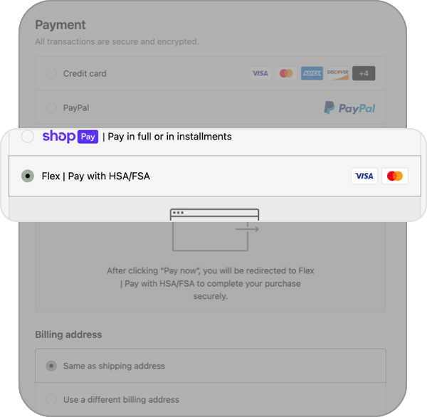 Yes, you can still be reimbursed for the expense. Select “Flex | Pay with HSA/FSA” at checkout. Instead of entering your HSA or FSA card, input your regular credit card. Flex will email you an itemized receipt following your purchase. Submit the itemized receipt to your HSA or FSA provider for reimbursement.